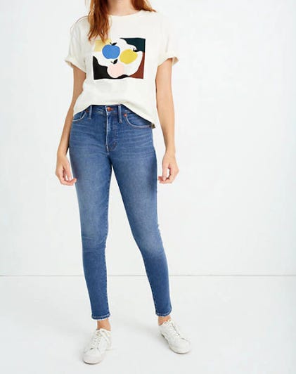 Full disclosure I work for Madewell, and I used my sweet employee discount to buy the new 9" Mid-Rise Skinny Jeans in Pearson Wash, and I'm obsessed. You can water down denim into two categories, stretchy and stiff. I love the look of rigid denim, but I hate breaking in a pair. The 9" Mid-Rise Skinny Jeans in Pearson Wash is made with a brand new material that looks like rigid denim, but they're stretchy. So they're my ideal pair of jeans.